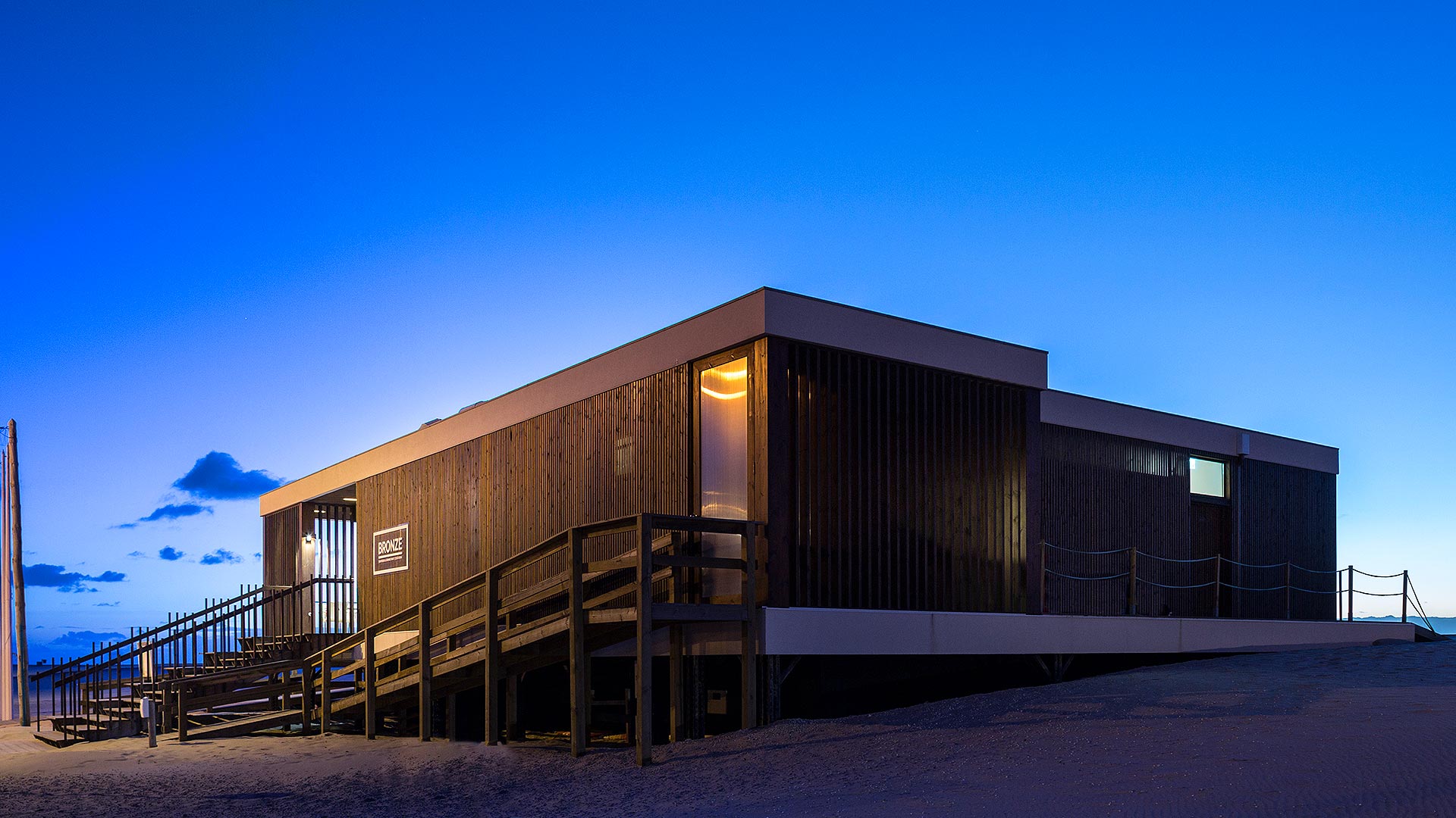 A madeira foi utilizada como revestimento, a verticalidade como principal elemento e utilizámos estacas para suportar todo o edifício, uma vez que este se encontra em cima da areia.